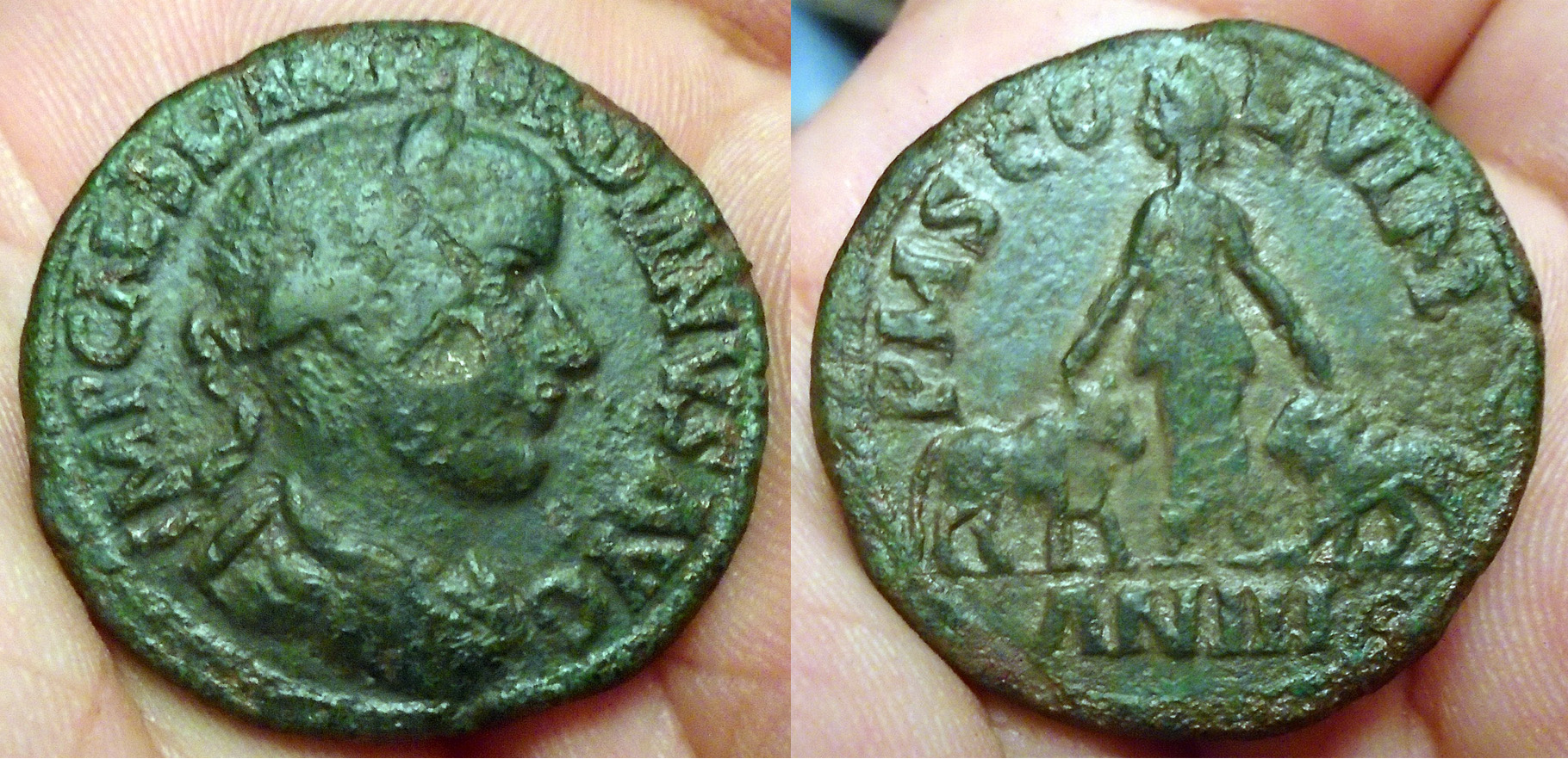 Obverse: Bust of Gordian to the right with laurel wreath, part of paludamentum (cloak, cape) visible on the shoulder worn over armoured breast plate. Text: (A:) IMP CAES M ANT GORDIANVS AVG (IMPERATOR CAESAR MARCVS ANTONIVS GORDIANVS AVGVSTVS) - Emperor, Caesar Marcus Antonius Gordianus Augustus. Reverse: Woman (Moesia) standing with head to the left holding her right hand over a bull and her left hand over a lion. Text: (c:) PMSCO - LIVM (PROVINCIA MOESIA SVPERIOR COLONIA VIMINACIVM) - Province Moesia superior Colony Viminacium. Exergue: AN .I.I. (ANNO .I.I.) - year 2 (240/241). Remark: This coin shows very well why some types are called "emperor seen from behind wearing paludamentum". The shoulder of Gordian is clearly visible and points forward as if the emperor has turned his back a little towards the viewer and turned his head a bit to the right. Another feature on this coin is the die makers fault IVM in stead of VIM in the text on the reverse. |