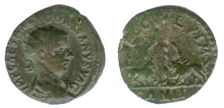 Obverse: Bust of Gordian to the right with radiate crown, part of paludamentum (cloak, cape) visible on the shoulder worn over armoured breast plate. Text: (B:) IMP CAES M ANT GORDIANVS VAG (IMPERATOR CAESAR MARCVS ANTONIVS GORDIANVS AVGVSTVS) - Emperor, Caesar Marcus Antonius Gordianus Augustus. Reverse: Woman (Moesia) standing with head to the left holding her right hand over a bull and her left hand over a lion. Text: (a:) PMSCO - LVIM (PROVINCIA MOESIA SVPERIOR COLONIA VIMINACIVM) - Province Moesia superior Colony Viminacium. Exergue: AN II (ANNO II) - year 2 (240/241). Remark: This coin has the die makers fault VAG in stead of AVG in the text on the obverse. |