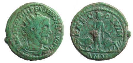 A possible explanation for this type of coins could be that during the local year VIIII (247/248) there was some strange mixup of coin dies and a die meant for antoniniani in the name of Philip the elder was used in combination with a die for an as in the name of Philip II. Some researchers have stated that antoniniani were already minted in Viminacium before the usurper Pacatian took over in Viminacium. This coin could be some proof that this was really the case.
